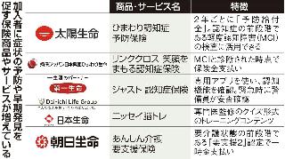 近年、認知症は、その前段階の軽度認知障害(MCI)の時点で適切な治療を受ければ、症状の抑制が期待できるとされる。MCIは血液検査で発症リスクが分かる。予防給付金を検査費用(2万円程度)に充てるなど、「早期発見や予防の取り組みに生かすことができる」(太陽生命広報の岡本将典さん)。