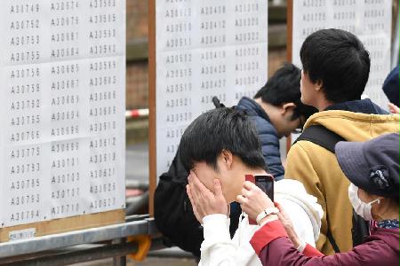 東大は10日、前期日程の合格者3018人を発表した。志願者は9483人だった。東京都文京区の本郷キャンパスでは、掲示板から自分の番号を見つけた受験生が「あった。やった」と歓声。合格した受験生は付き添った両親と抱き合ったり、掲示板の前で記念写真を撮ったりして、喜びを分かち合っていた。