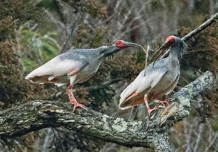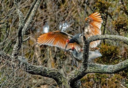 求愛の擬交尾をする7歳雄(上)と6歳雌のトキ。雑木林の枯れ枝に鮮やかなとき色の羽が浮かび上がった =新潟県佐渡市(キヤノンEOS-1DX MarkII EF800mm 1/800、f 5.6、ISO640)