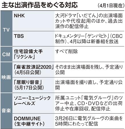 麻薬取締法違反の疑いでミュージシャン、俳優のピエール瀧被告(51)が逮捕された事件を受け、テレビ局や映画会社は出演作品の配信停止などの対応に追われている。2日に、同被告は同法違反の罪で起訴された。不祥事に対する世論の反発を考慮した対応だが、「行き過ぎた自粛だ」との声も上がっている。(三宅令)
