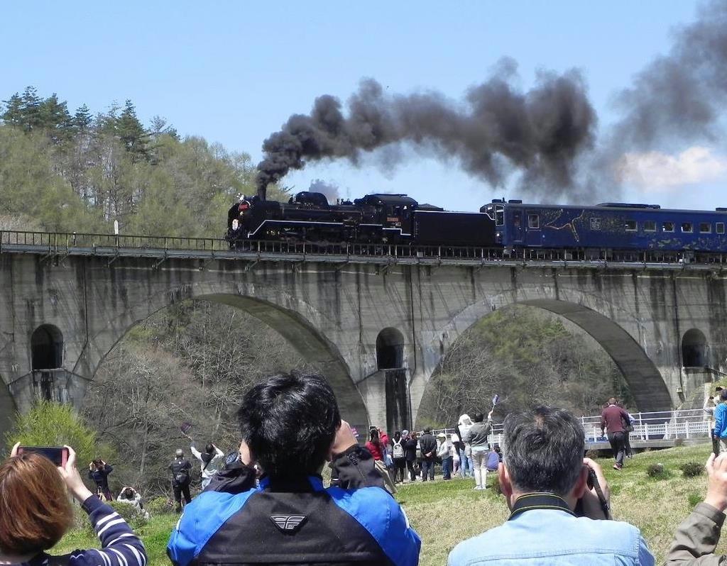 午前11時40分すぎ、通称めがね橋を通過する「SL銀河」にカメラを構えた福島県いわき市のトレーラー運転手、吉田忍さん(51)は「夫婦でここに来るのは3年連続。好天恵まれ岩城氏の好天に恵まれ最高のショットが撮れた」と笑顔で話していた。