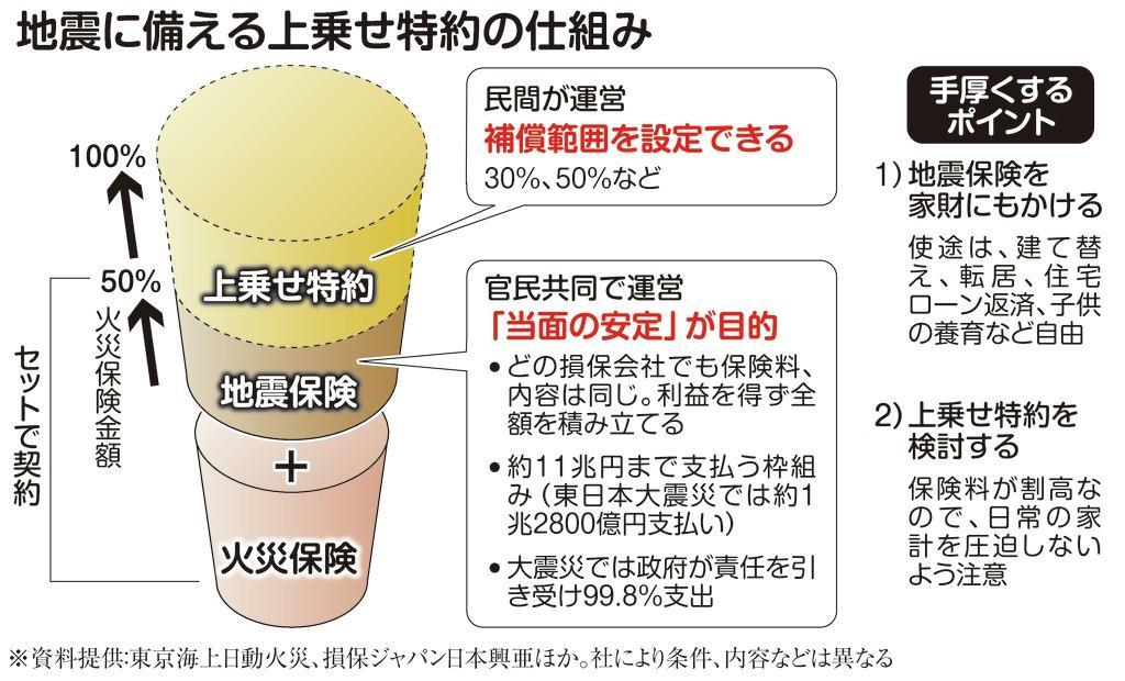 しかし、保険金を自由に使える一方で、通常の地震保険の目的は「(当面の)生活の安定」(地震保険法1条)にとどまり、当座をしのぐのが狙い。倒壊した家屋の再建には不十分とする声が長らくあった。保険料も、中立の機関が算定して都道府県ごとに一律。補償内容も火災保険金額の50%が限度で、「100%の補償」を望む声が根強くあった。