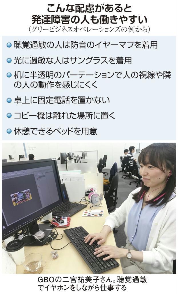 GBOは、ソーシャルゲーム大手「グリー」(東京都港区)が障害者雇用促進のために設けた特例子会社。社員52人中、46人が障害者手帳を持ち、33人が発達障害。今月のオフィス移転にあたって、発達障害当事者の声も取り入れた。
