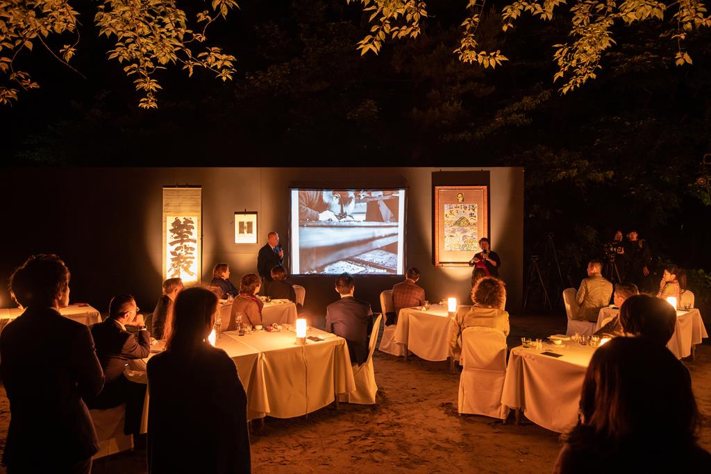 我々を出迎えてくれたのは、今回のダイニングアウトのホスト役で米国出身の東洋文化研究家、アレックス・カー氏。彼のウエルカムスピーチに耳を傾け、乾杯を終えると、一行は美術館の中へと案内された。