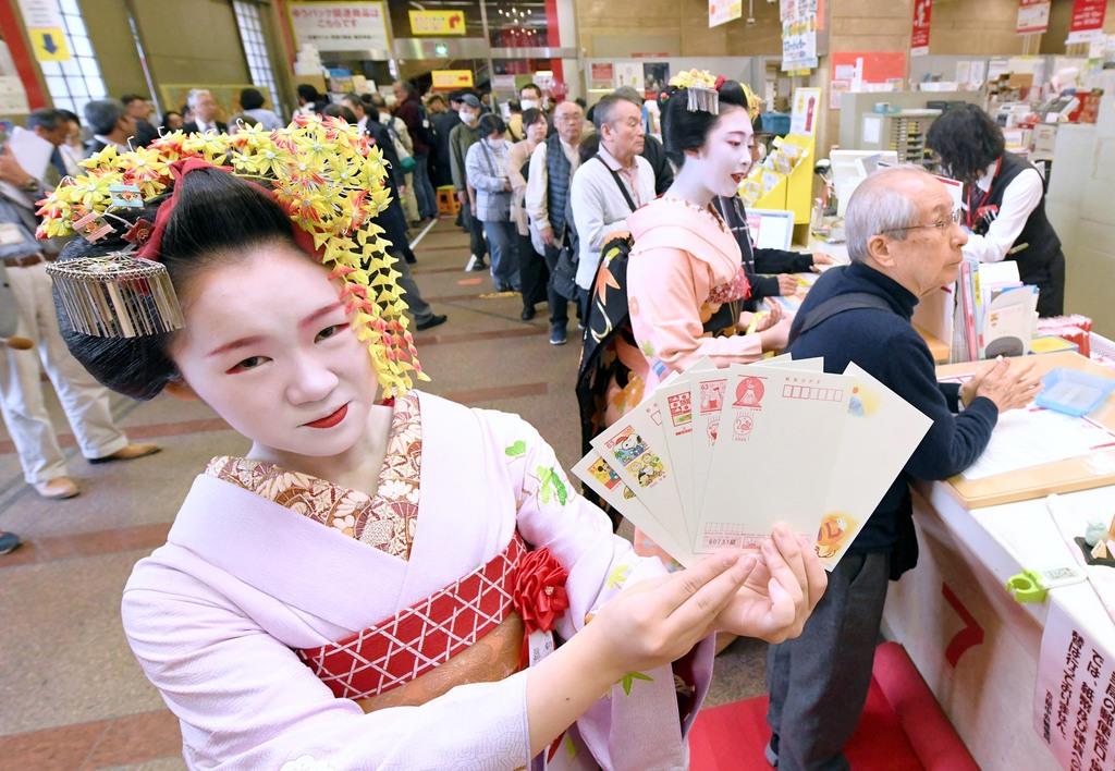 令和となって初めての来年のお年玉付き年賀はがきの販売が1日、全国で一斉に始まった。京都中央郵便局(京都市下京区)では京都五花街の一つ、宮川町の舞妓(まいこ)2人も参加し、販売開始セレモニーが開かれた。
