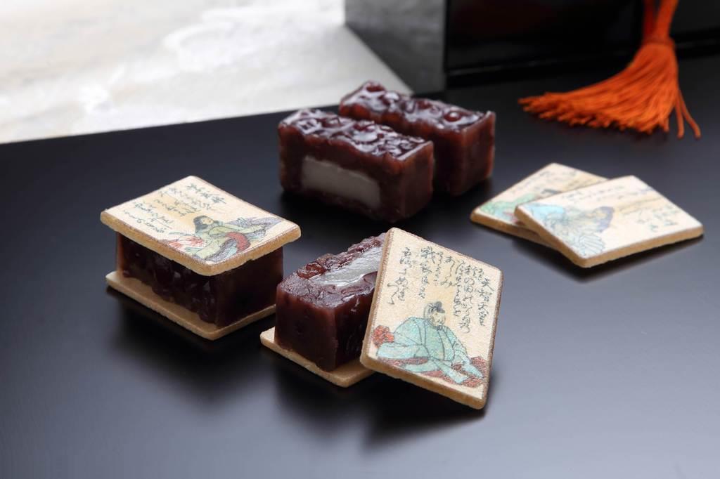 小倉百人一首の巻頭歌を詠んだ天智天皇を祭り、「かるたの聖地」として知られる近江神宮(大津市)から、高松宮家由来のかるた札を借り、25枚の絵札を縦5・5センチ、横4センチの最中の皮に精密にプリントした。5種類で1セット(税抜500円)で、同店の代表銘菓「あも」をサンドイッチのように挟む食べ方がおすすめといい、あもとのセット(同2400円)も販売している。「どの絵札がセットに入っているかは開けてからのお楽しみ」(担当者)という。