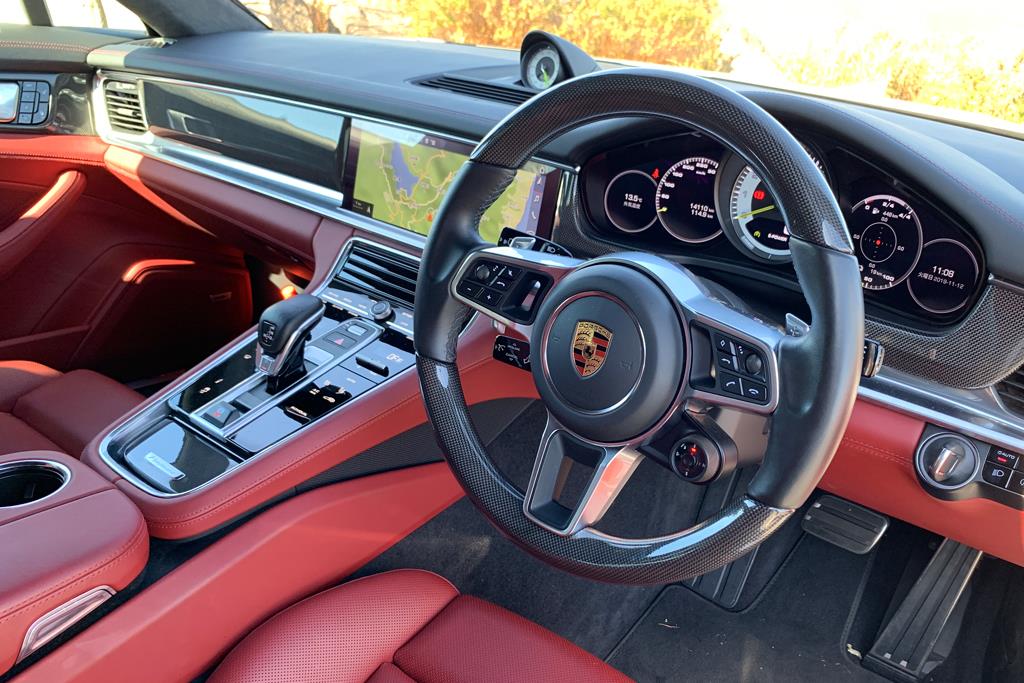 ボディサイズに続く第二の驚きは、着座位置の低さだった。想像していた以上にアイポイントが路面に近い。この点に限って言えば、このクルマはセダンではない。完全にスポーツカーだ。目の前に並ぶ5連メーターやダッシュボードの中央に据えたストップウォッチ、インテリアのデザイン形状や車内に漂う雰囲気はしっかりと“ポルシェらしさ”を纏っている。ポルシェに乗るのは昨年取り上げた911カレラのMTモデル以来だが、当時に近い感覚が一気によみがえってきた。