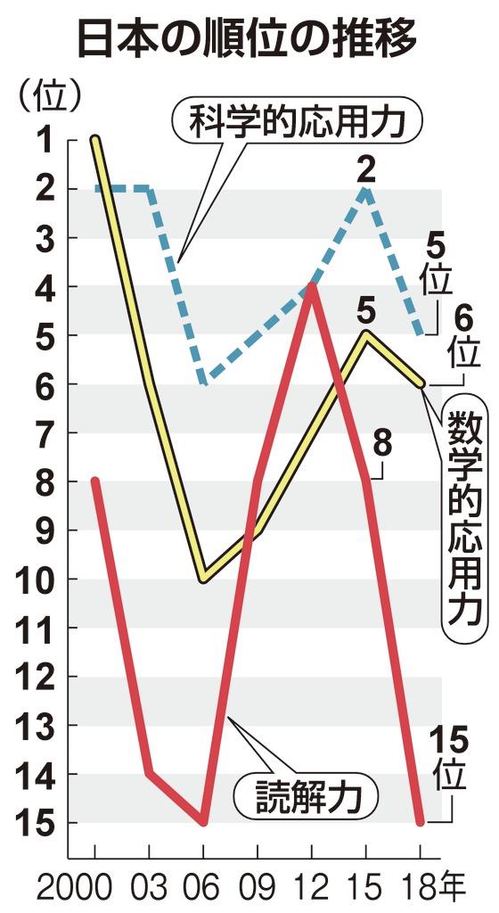経済協力開発機構(OECD)は3日、世界79カ国・地域の15歳を対象として2018年に実施した国際学習到達度調査(PISA)の結果を公表した。日本は読解力が前回(15年調査)の8位から15位と大きく後退したほか、数学的応用力が前回の5位から6位に、科学的応用力も2位から5位に順位を落とした。文部科学省では、読解力の記述式問題などで課題が浮き彫りになったとみて、学力向上策など検討する。