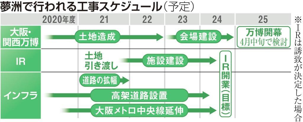 その区域認定のスケジュール自体がまだ明確になっておらず、再来年の2021(令和3)年7月以降としか定まっていない。吉村洋文知事も「21年秋に土地を引き渡してそこからトンカチ(工事)を始めるにしても、万博開幕までにどこまでできるか」と過密日程になるとの見通しを示す。