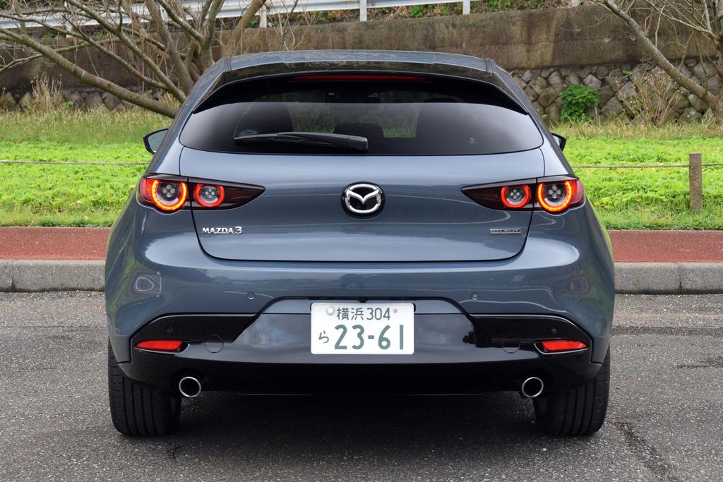 深化した魂動デザインを纏ったMAZDA3。個人的には特にリヤの造形に惹き付けられる。リヤピラーとフェンダーを結ぶ妖艶な曲線や、尻上がりにカットされた後席ウインドーの形状がもたらすリヤクオーター周辺のボリューム感。そして、極端に寝かせたリヤウインドーやテールランプ周りのボディの張り出し。このシルエットだけで「MAZDA3だ」と分かるアイデンティティと、ほかにはない独特の麗しさがある。むやみやたらに線を加えることなく、ボディの「面」で動きを表現することで、矛盾するかのように “さりげなく圧倒的”な存在感を生み出しているのだ。