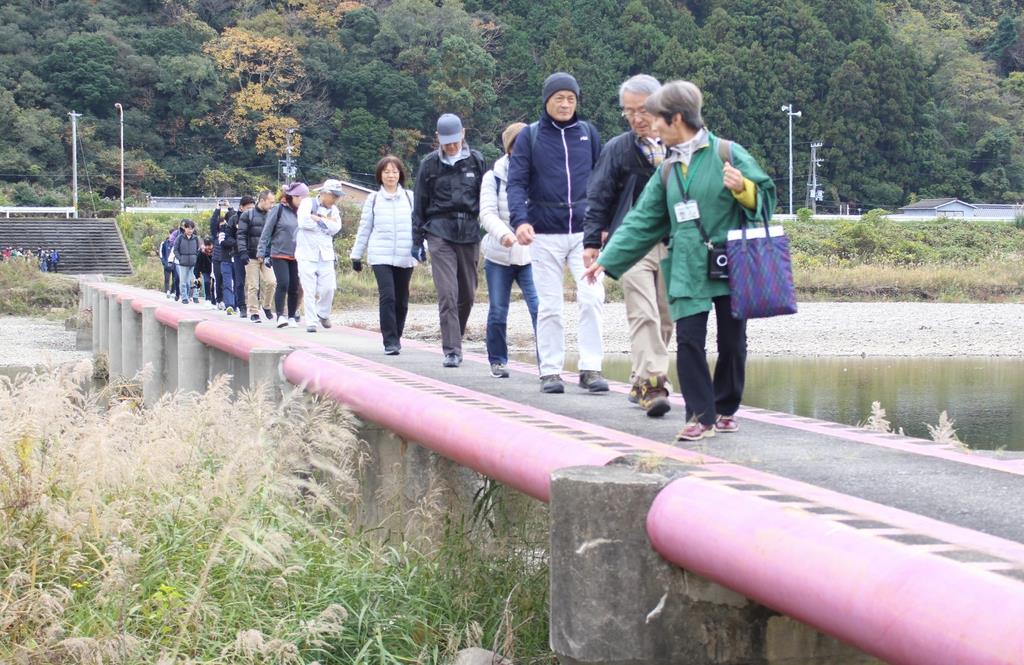 同県上富田町を流れる富田川上にかかる「山王橋」。欄干がなく道幅の狭い橋の上を参加者らは足元を確かめながら慎重に渡った。