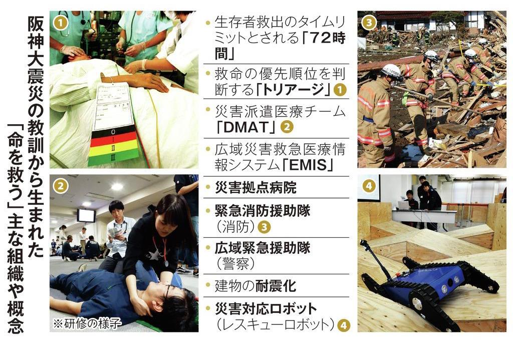生存者救出のタイムリミットとされる「72時間」や現場で救命の優先順位を判断する「トリアージ」、建物の耐震化、災害対応ロボット(レスキューロボット)の開発もその一例だ。