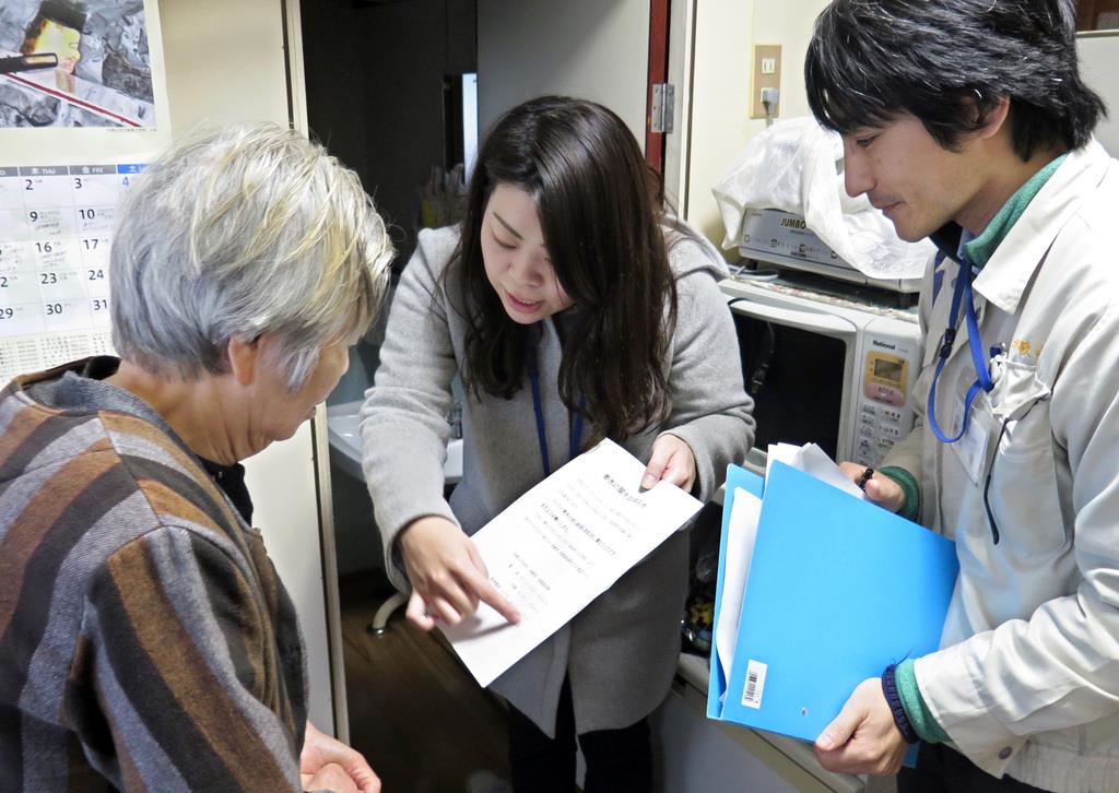 市職員らは18日、高齢者宅を巡回し、給水袋を配ったり、緊急連絡先を説明したり、前日も対応に追われた。断水の対象となる新南地区の女性(84)は「足が悪く、給水所まで行けない。できるだけ自宅で生活に必要な水を備蓄するしかない」と困惑していた。
