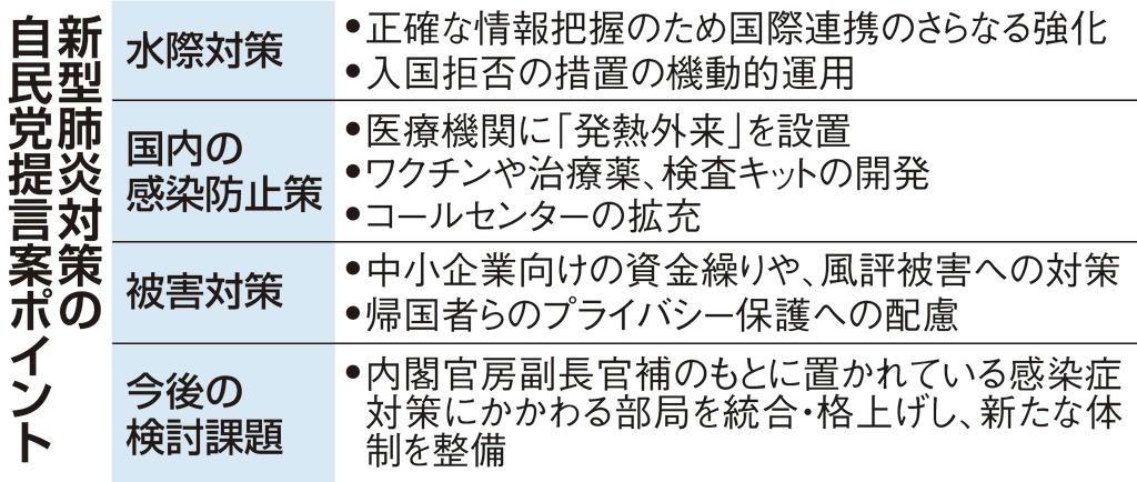10項目を超える提言案は5日の党対策本部でまとめた。中国湖北省以外で感染が広がった場合に入国拒否の措置を速やかに拡大できるよう機動的な運用を求めたほか、中国からの航空便に対する検疫、健康監視を含む水際対策の強化を盛り込んだ。