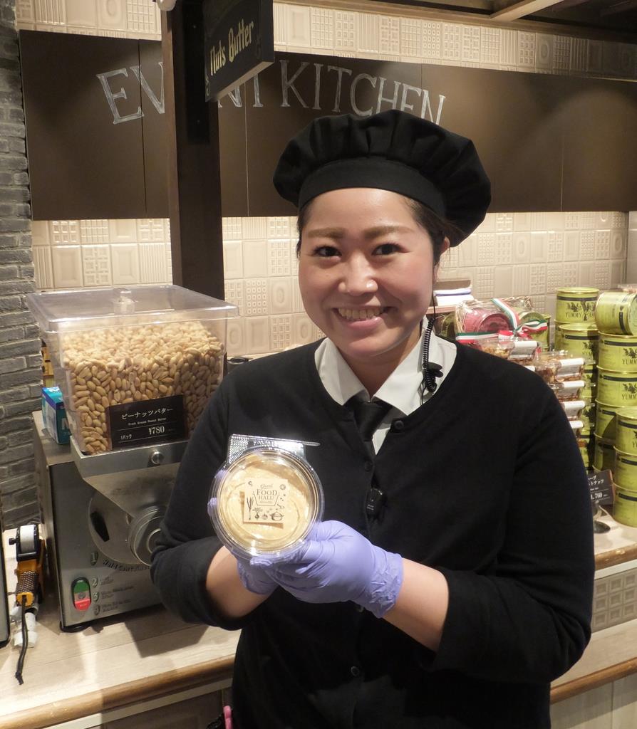 東京都港区の六本木ヒルズ地下2階にある「グランドフードホール」。ピーナツバターを注文すると、専用マシンの豆がにゅるにゅるとペースト状に絞り出された。できたてはクリーミーで濃厚な味と香り。「パンに塗るのはもちろん、ポン酢と合わせてお鍋のタレに、あえ物や担々麺など、さまざまな料理のコク出しに、練りごまのように使えます。温めたミルクとハチミツに溶かしてもおいしい」と土橋純子店長(35)。