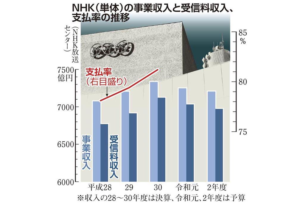 今年10月からの値下げの影響で、令和2年度の受信料収入は前年度比58億円減の6974億円を見込む。それでも、売り上げ規模では民放キー局トップの2倍を優に超える。事業支出は前年度比76億円増の7354億円。マイナスとなる収支の差額は、元年度末で1041億円を見込む繰越金から補填(ほてん)した。