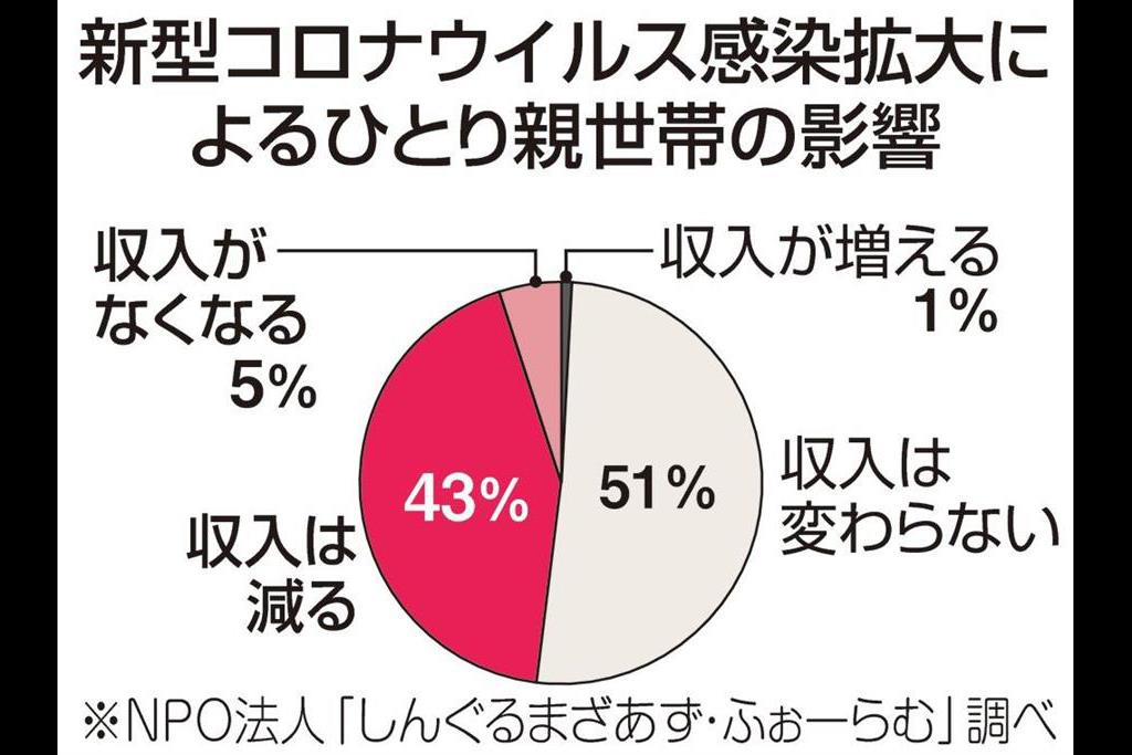 NPO法人「しんぐるまざあず・ふぉーらむ」が今月上旬、ひとり親世帯に実施した緊急アンケ-ト(232人が回答)では、約5割が新型コロナウイルスの影響で収入が「減る」「なくなる」と回答。親たちからは「仕事を2つ掛け持ちしているが、サービス業が自宅待機になる可能性があり、収入が減ることが不安」「仕事が少なくなったので、シフトや勤務時間を減らされた」-などの声も寄せられた。