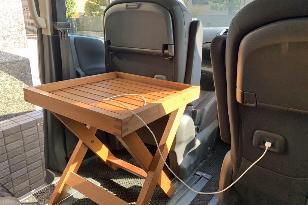 外出自粛なので家族総出で出かけることもなく、基本パソコン以外は置きっぱなしですが、もしも複数が乗車することがあっても折り畳み式テーブルであればサッと畳めてラクですね。キャンプ用のテーブルが無いご家庭は頑丈な段ボールでも可能です。ちなみに、夫婦のテレワークが重なった本日は…