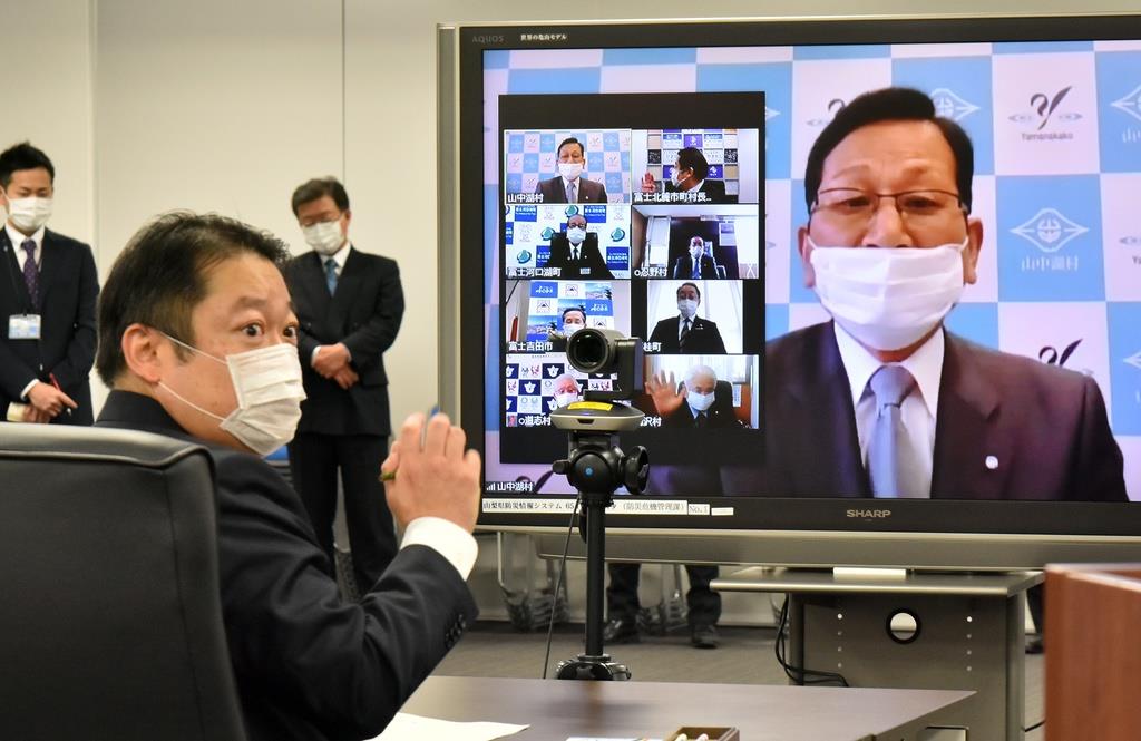 スバルライン閉鎖はこの日、県庁と富士吉田市など富士北麓7市町村を結んで行われた知事と市町村長のテレビ会議で合意された。市町村長からは県外からの来訪が減らないことへの強い危機感が示された。
