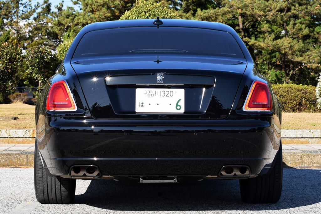ゴーストはロールス・ロイスの中で中核モデルの役割を担っているが、いざ目の前にすると言わずもがな立派な体躯をしている。威風堂々と構える伸びやかなボディは全長5399mm、全幅1948mm、全高1550mmを誇り、ホイールベースは3mを優に超える。パワートレーンは6.6LのV型12気筒ターボエンジンに8速ATが組み合わされ、標準モデルから42馬力も引き上げたブラック・バッジは612PSというハイパワーを絞り出す。