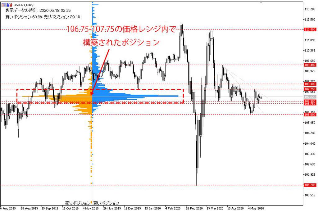 OANDAのオープンポジションを見ると、揉み合うような動きが続いたことにより、先週の価格レンジの中心となる1米ドル=106.75~107.75円の水準で構築されたポジションが多い状態です。