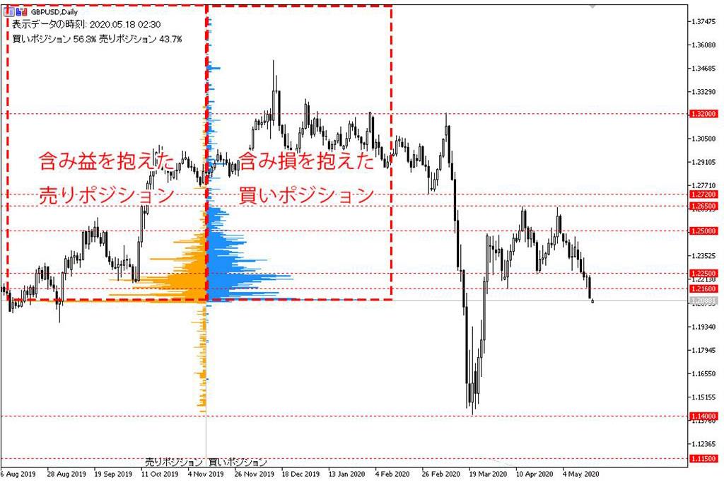 オープンポジションを見ると、どの水準に含み損を抱えたポジションが多いかを視覚的にチェックすることができ、次にどちらに動いた方が、価格の動きが大きくなりそうか(損切り注文が多く出そうか)を予想することができます。