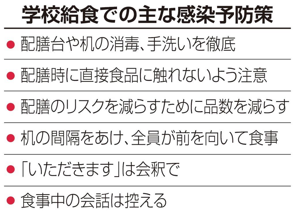 再開には、感染予防策が不可欠だ。ほぼすべての学校で、従来のような対面方式は当面控え、全員が前を向いた状態で食事。無言で食べ、食べ終わったらすぐにマスクをするよう指導する。8日から再開する京都市立小中学校では、「いただきます」のあいさつはマスクをつけた教員だけが発声、児童生徒は無言で会釈するという。