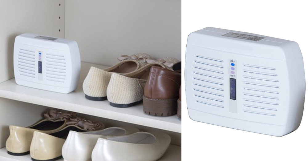 「コンパクト除湿器 3個組」8,490円(送料無料)は、タンス、シューズラック、クローゼットなどの、除湿したいところに置くだけ。乾燥時は表示窓の中身が濃紺に、吸湿量がいっぱいになると表示窓の中身が赤紫になり再生時期をお知らせします。吸湿した水分を内蔵のヒーターで強制乾燥し、約100回まで繰り返し使えるリピート除湿器です。再生時期が一目で分かるのもうれしいポイントです。吊り下げ用のフックが付いているので、クローゼットでの使用も簡単です。