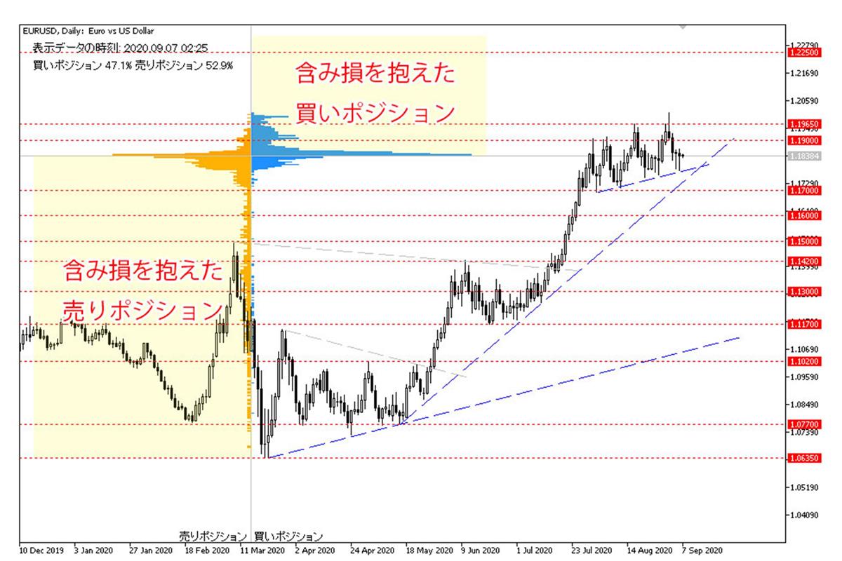 オープンポジションを見ると、どの水準に含み損を抱えたポジションが多いかを視覚的にチェックすることができ、次にどちらに動いた方が、価格の動きが大きくなりそうか(損切り注文が多く出そうか)を予想することができます。