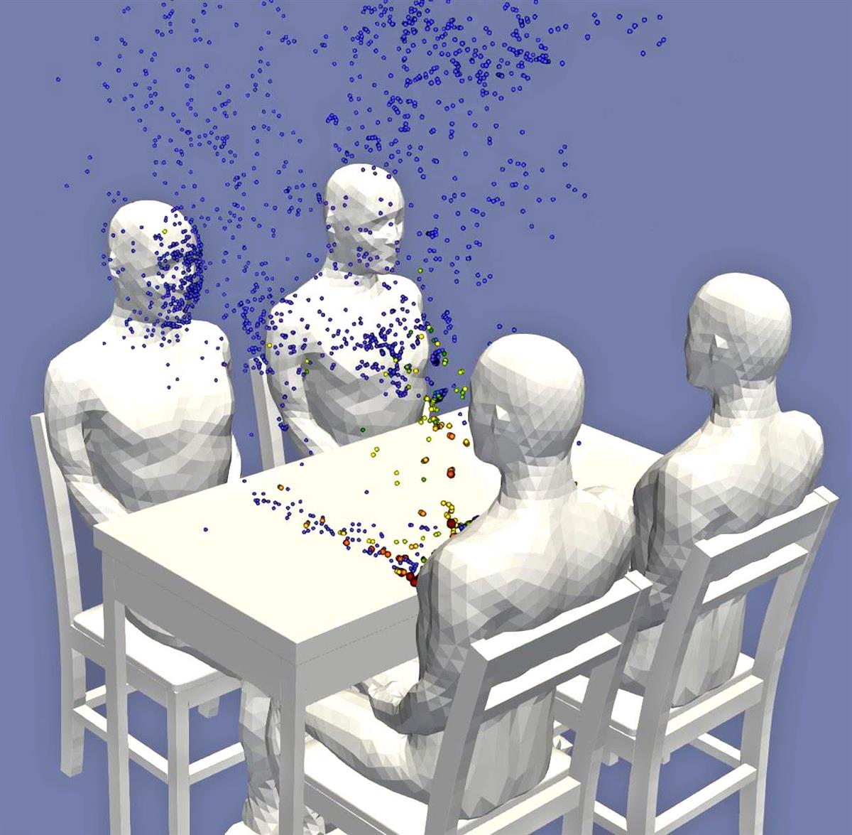 その結果、飛沫は話しかけた相手に対してまっすぐに飛ぶ性質が強いことから、話しかけた人以外にはほとんど到達しないことや、感染者が相席者に均等に話しかけた場合には隣席にもっとも多く届き、次いで正面、はす向かいの順になった。隣は正面に比べて5倍の飛沫が届き、はす向かいは正面の4分の1程度に減ることが判明した。