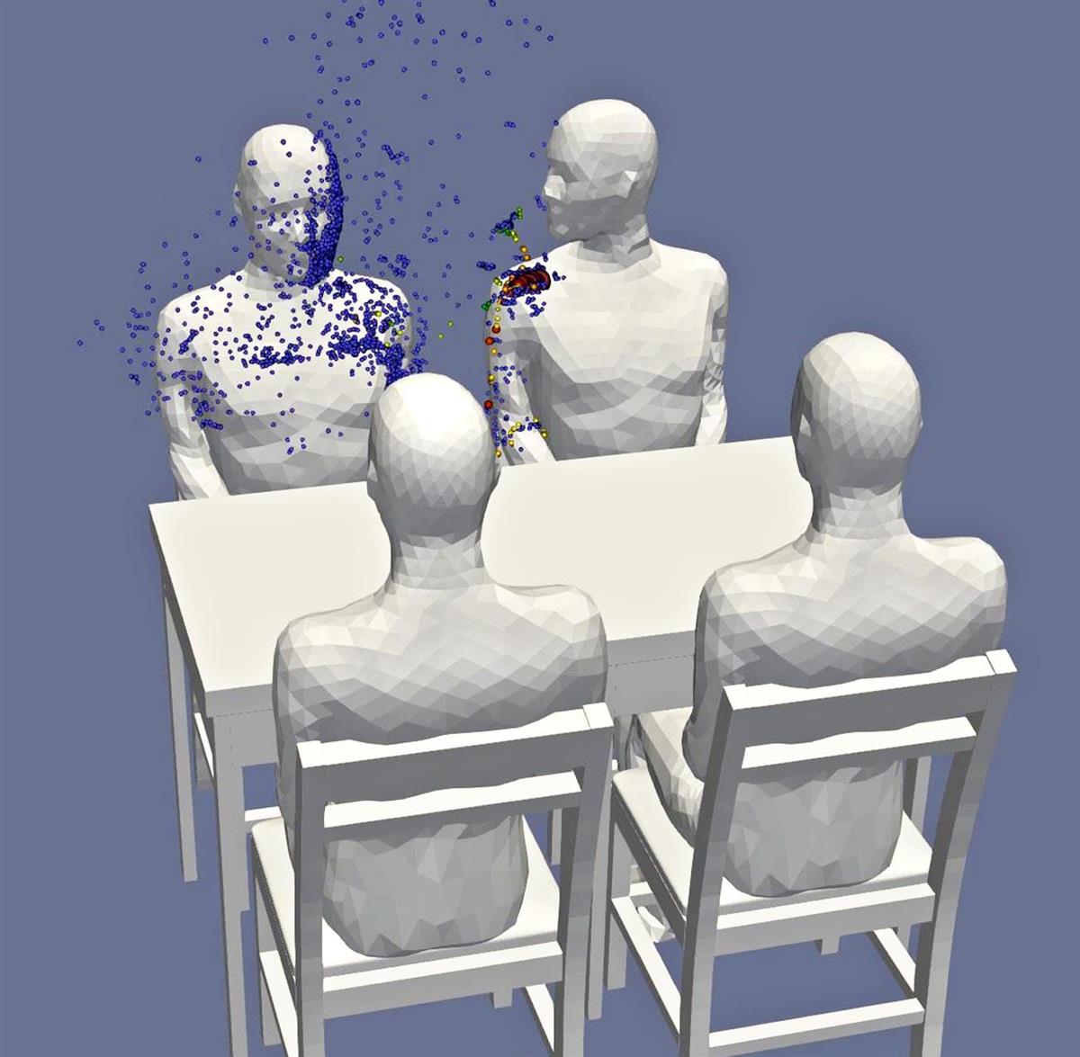 シミュレーションでは、飲食店でテーブル(縦60センチ、横120センチ)を4人で囲み、うち1人の感染者が、正面、はす向かい、隣の相席者に向かって1分間程度の会話をしたケースを想定。座る場所によって届く飛沫の数がどう違うかを調べた。