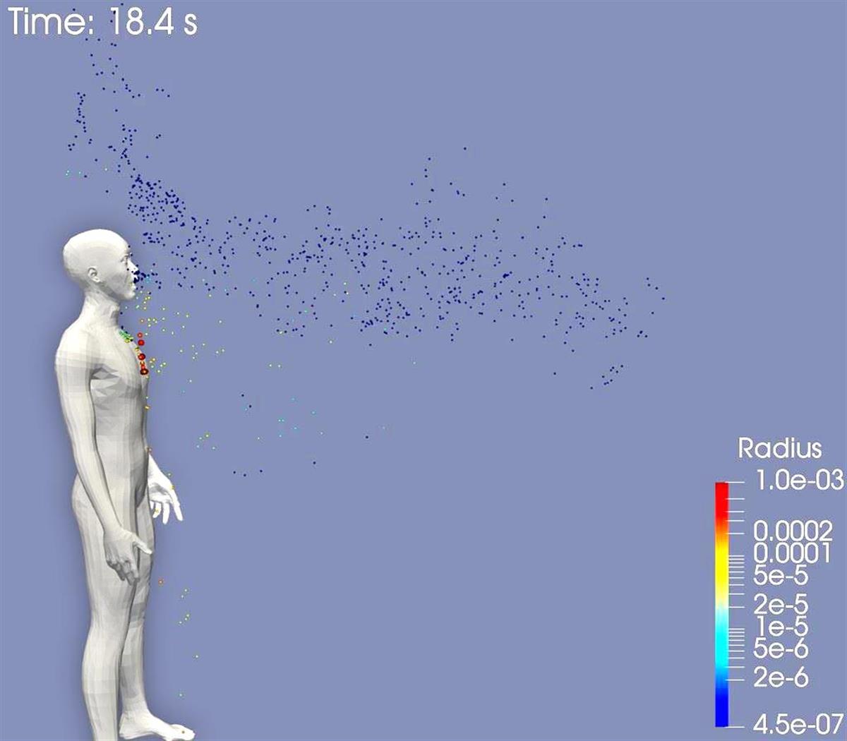 会話では1分間に約900個の飛沫、エアロゾルが飛び、歌の場合は1分間に約2500個飛ぶ。一方、強いせきを2回すると、合計で3万個ほどが飛ぶことが分かった。