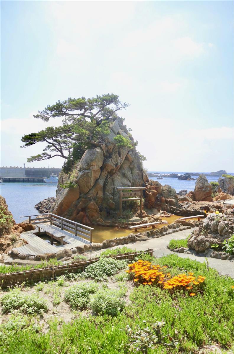 足付(あしつき)温泉は松と岩礁の眺めが美しく、島内で唯一、無色透明な湯が湧くという。