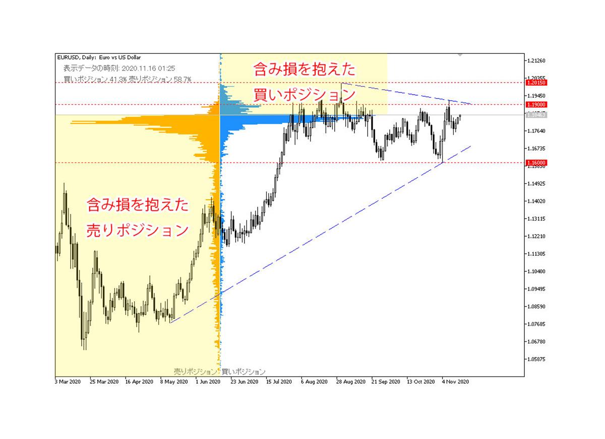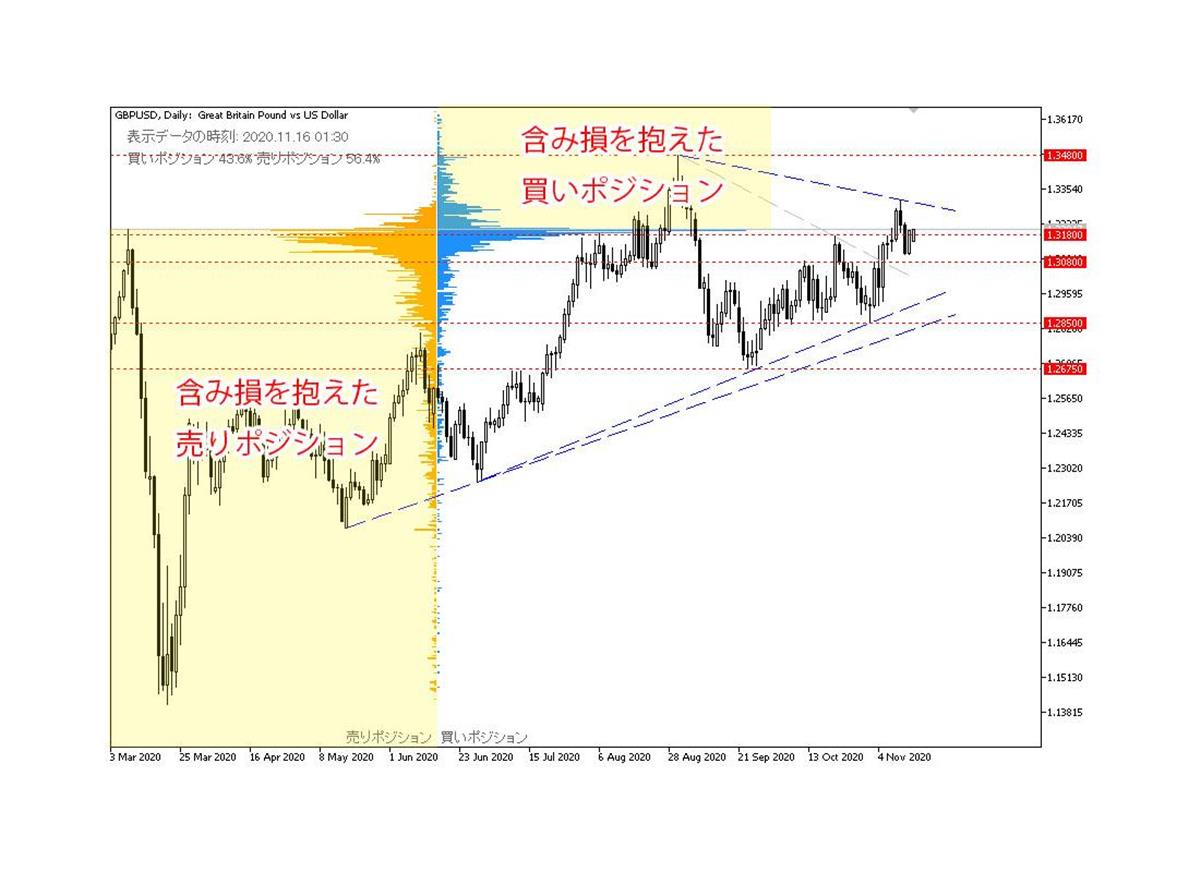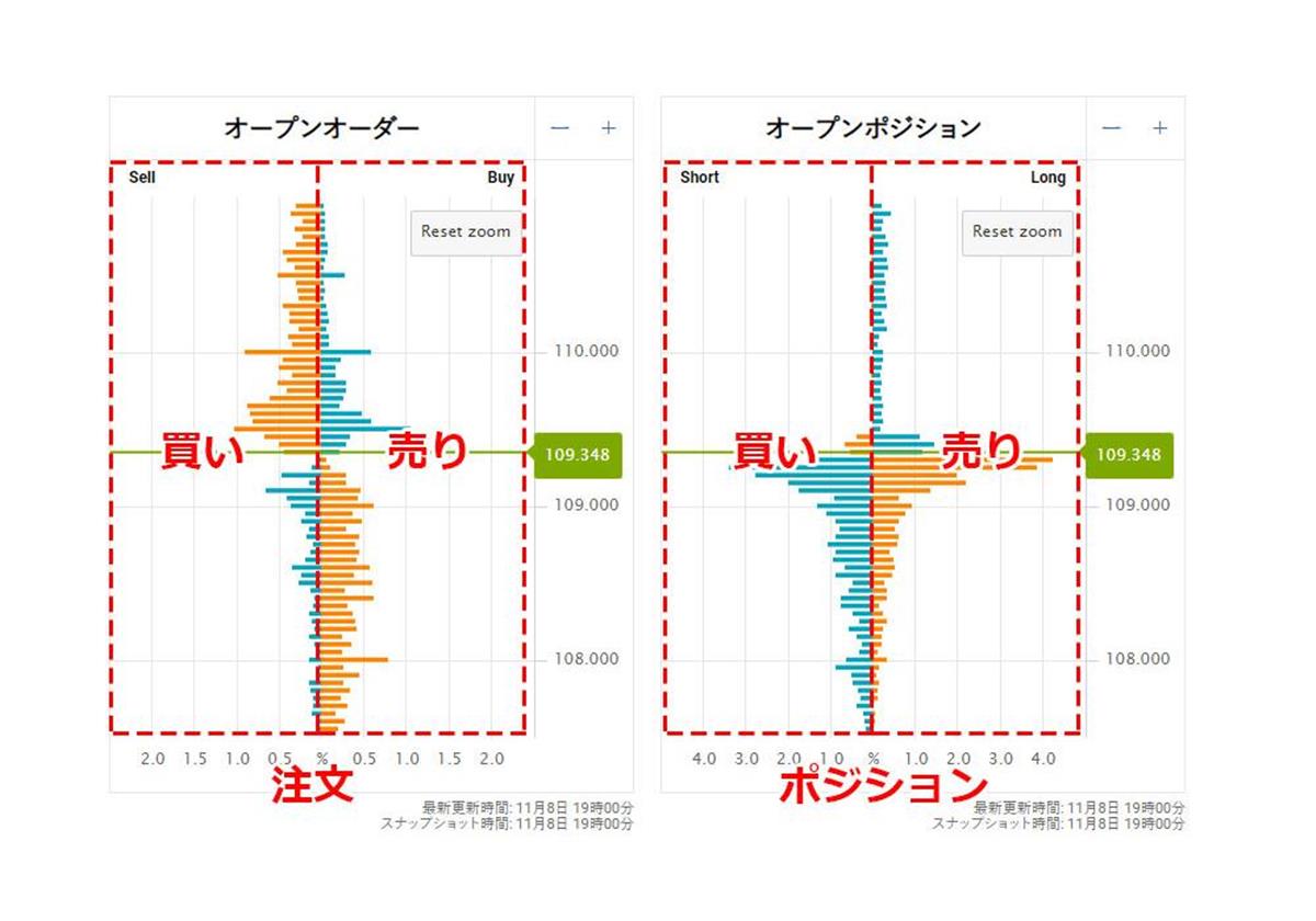 オープンポジションを見ると、どの水準に含み損を抱えたポジションが多いかを視覚的にチェックすることができ、次にどちらに動いた方が、価格の動きが大きくなりそうか(損切り注文が多く出そうか)を予想することができます。