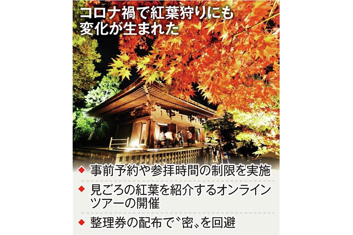 新型コロナウイルスの感染再拡大は、ピークを迎えつつある紅葉狩りにも影を落としている。事前予約を設けたり、オンラインツアーを開催したりするなど、各地の名所は3密回避に向けて試行錯誤。「制限の中でも堪能を」「今年は譲り合いで」。第3波の到来も指摘される中、さらなる知恵と工夫が求められている。(石橋明日佳)