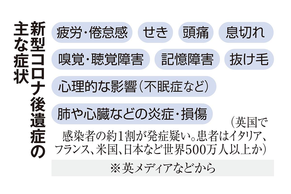 英国家統計局が16日に発表した調査結果では、イングランドの約8200人の新型コロナ患者のうち約10%が12週間を過ぎても症状が続いた。英メディアによると、英インペリアル・カレッジ・ロンドンのアルトマン教授(免疫学)は統計などから、後遺症に苦しむ患者は世界で500万人以上いると推定している。