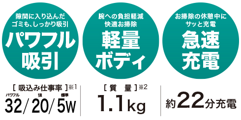 吸引はワンタッチスイッチで「パワフルモード」「強モード」「標準モード」の3段階の切り替えが可能です。「パワフルモード」は、「強モード」の約40%も吸引力がアップします。フローリングのすき間に入り込んだ砂粒や髪の毛、重たいゴミも、グングン吸い込みます。充電時間は約22分。スピーディーにフル充電できます。お掃除の休憩中にサッと充電できるのも、うれしいポイントです。連続使用時間は、「パワフルモード」で約10分。「強モード」で12分。「標準モード」であれば約25分の連続使用が可能です。