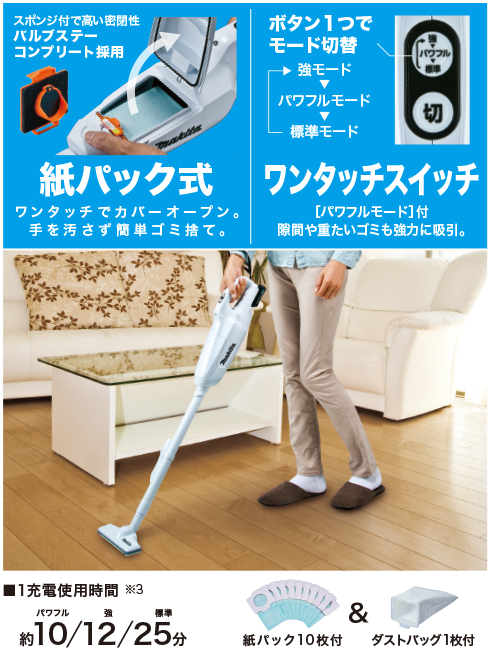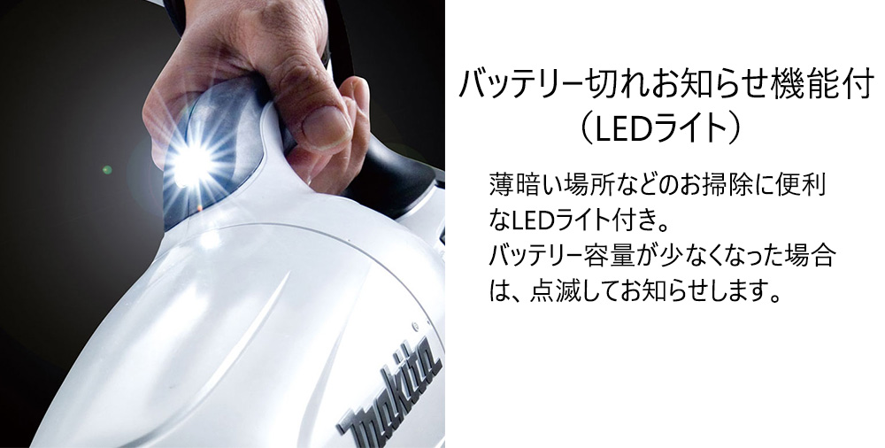 ゴミ捨て方法は、簡単な紙パック式で、新しいフロントカバーを採用。ボタンを押せばフロントカバーがオープン。ゴミ捨てが更に手軽になります。フロントカバーを完全にはずす必要がないので、手が汚れる心配もありません。重量は、本体にバッテリーを装着させた状態で約1.1kgとコンパクトな軽量モデルです。ストレートパイプとノズルを装着しても、片手で楽にお掃除ができます。「キッチン」に。「階段」に。「車内」に。「サッシ」に。いろいろな場所で使えて、女性やお子様、ご年配の方でも楽にお使いいただけます。さらに、先端にはLEDライトが搭載されているので、うす暗いクローゼットや自動車の室内の掃除もはかどります。バッテリー容量が少なくなった場合は、LEDライトが点滅してお知らせしてくれるので便利です。