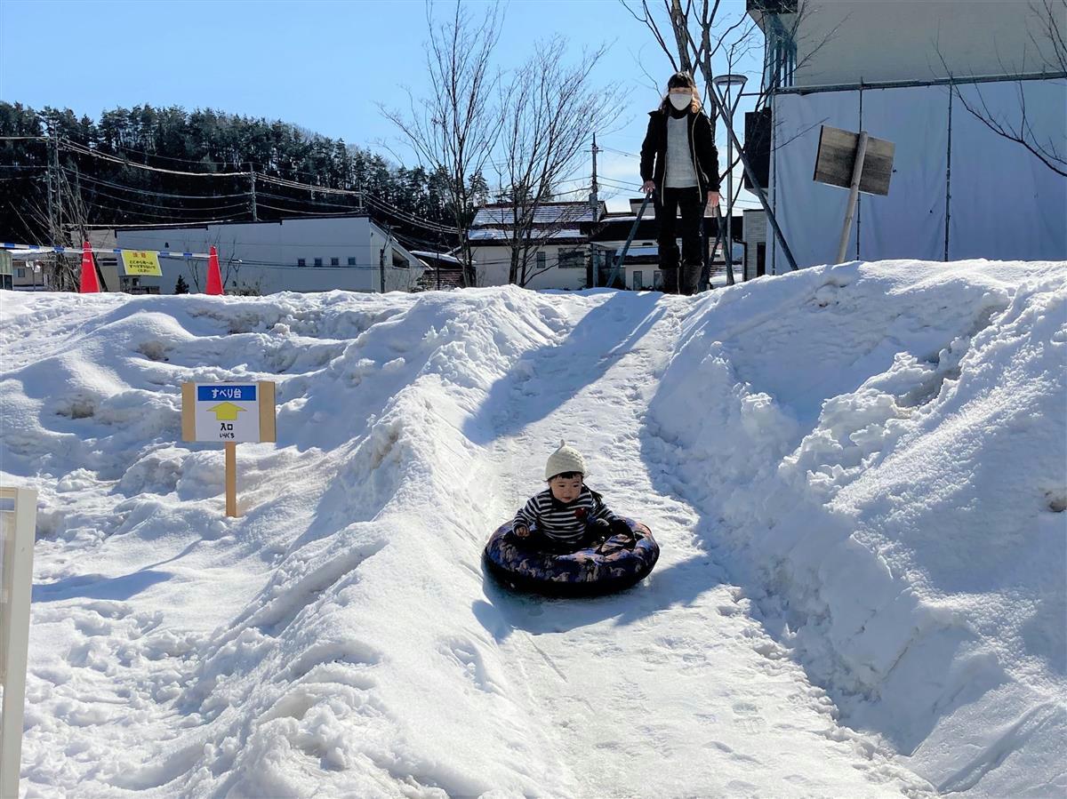 長さ20メートルの大型と、5メートルの小型のすべり台のほか、高さ2メートル、幅3メートルのかまくらもある。