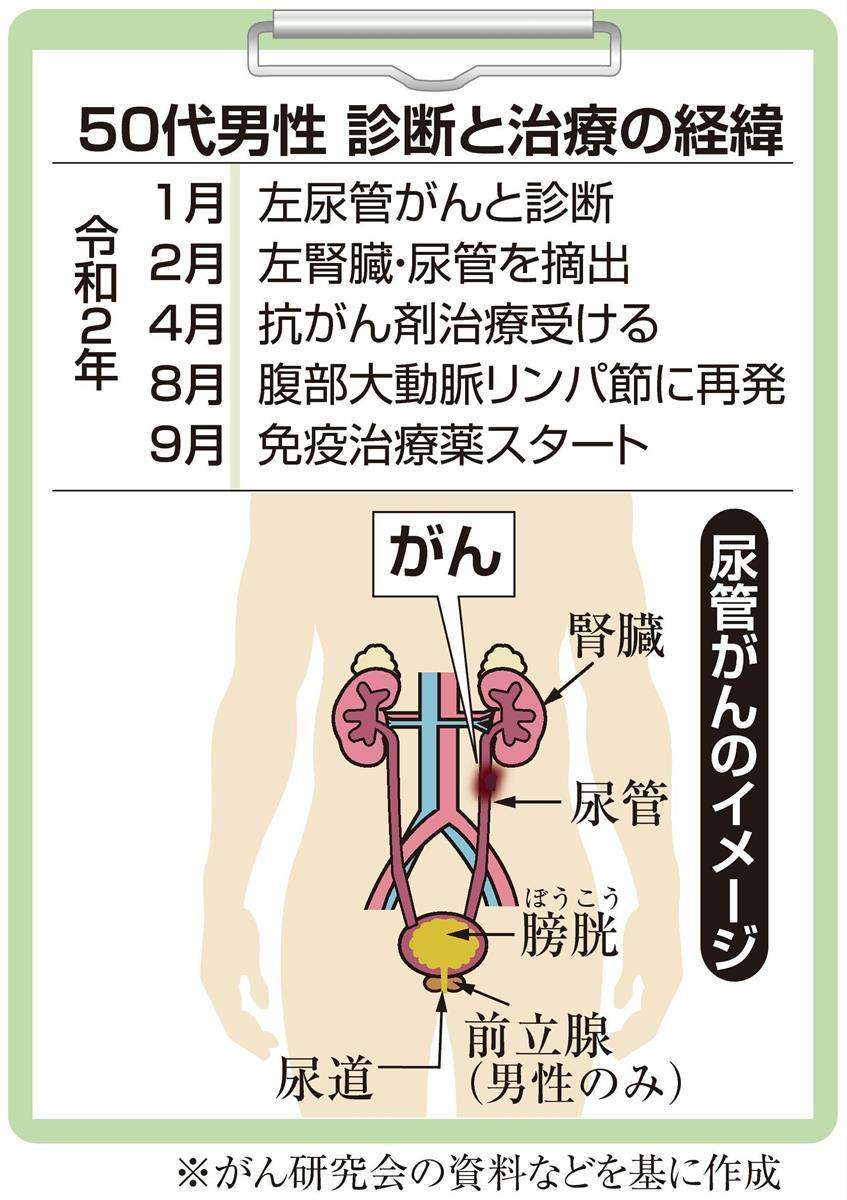 Q 50代の男性です。平成30年6月の検診で血尿を指摘され、超音波検査で調べましたが、異常を認めませんでした。1年後、今度は赤ワインのような血尿が出たので、総合病院で造影CT(コンピューター断層撮影)検査を受けましたが、経過観察になりました。11月、再度の造影CT検査で異常が疑われ、令和2年1月、尿管鏡検査で左尿管がんと診断されました。2月に腹腔(ふくくう)鏡にて左腎臓と尿管を摘出。4月から補助療法として抗がん剤のカルボプラチン+ゲムシタビンの併用を3クール受けました。8月にCT検査で腹部大動脈リンパ節に再発を確認。9月から免疫治療薬キイトルーダがスタートし、12月までに5コース終えました。