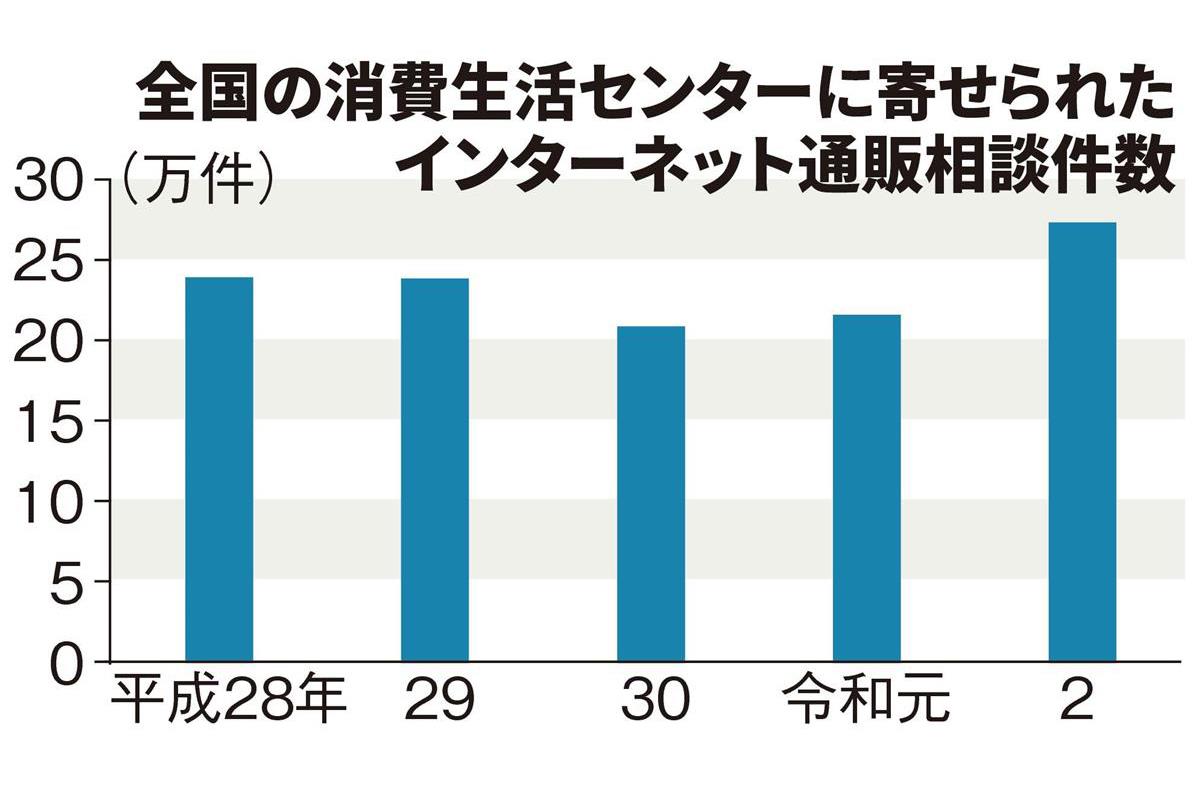 こうした中、全国の消費生活センターに昨年寄せられたネット通販をめぐる相談は前年比5万7284件増の27万3271件と、過去5年で最多となった。