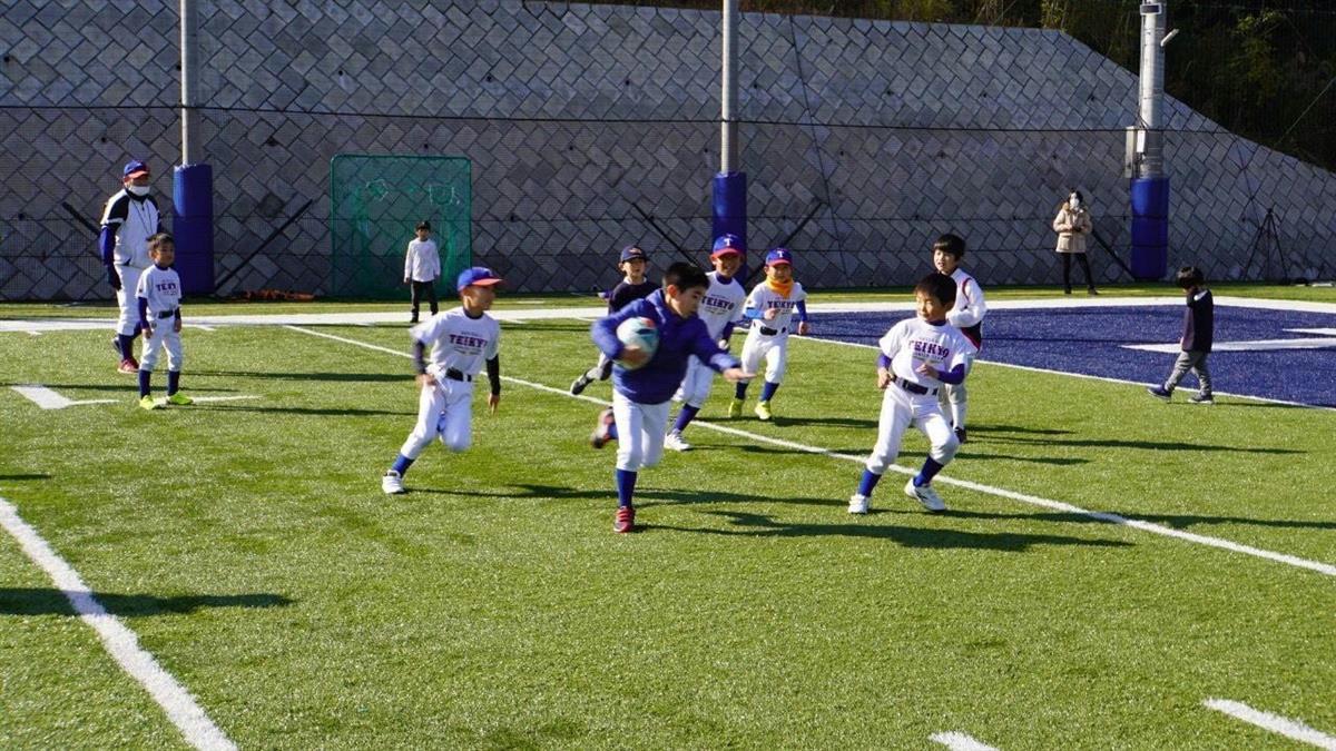 野球のユニホーム姿でアメフトやサッカーを練習する子供たち。帝京大学が昨年12月に設立した国内初の大学学童野球部「帝京ベースボールジュニア」では、マルチスポーツを実践している。複数種目を経験するなかで、幅広い視野やスポーツの魅力を学ぶ狙いがある。