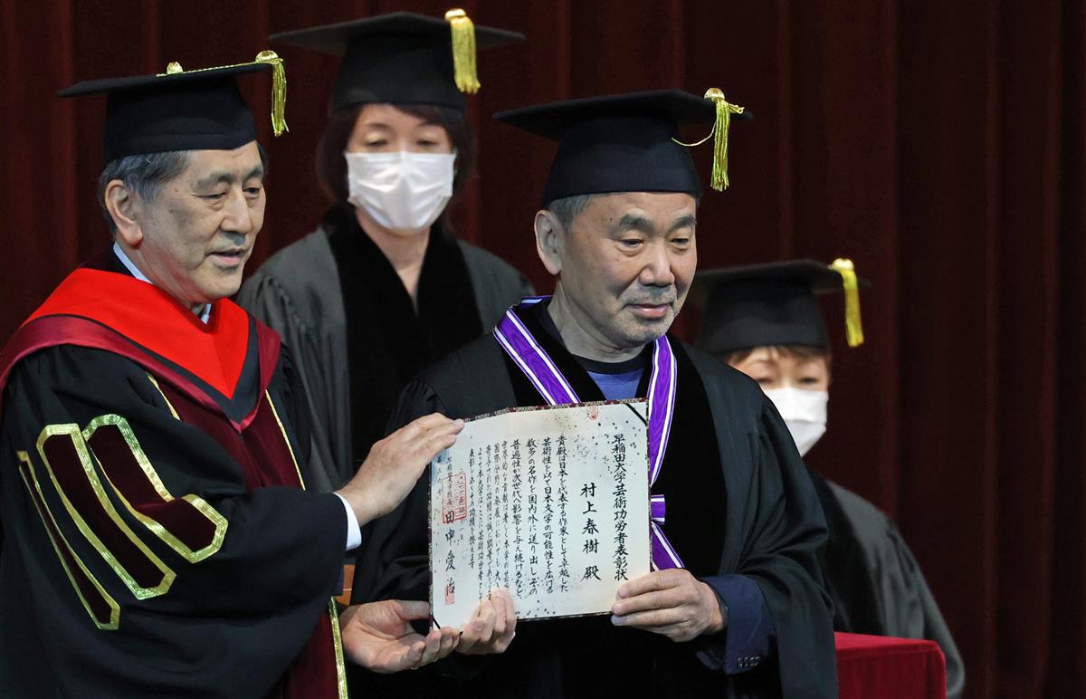 村上さんは昭和50年の第一文学部(当時)卒業生。芸術の振興に顕著な貢献をした校友に贈られる同大の芸術功労者表彰を受けるために出席した。黒い式服に身を包み、まずお祝いの言葉を述べた村上さんは「僕は在学中に結婚し仕事を始めて最後が卒業。普通と逆ですが、なんとかなるものです」と学生時代を回想。創作を志す新入生も多い両学部だけに「小説家は頭があんまりよくてもなれない。必要に応じて頭を使い、心で考える。秀才でも優等生でもないちょうどいい頃合いを見つけてください。松明のように受け継がれてきた小説を、大事にサポートしてくれる人がいたら僕としてはうれしい」などと語りかけた。スピーチを終えた村上さんが田中愛治総長から表彰状とメダルを授与されると会場は大きな拍手に包まれた。