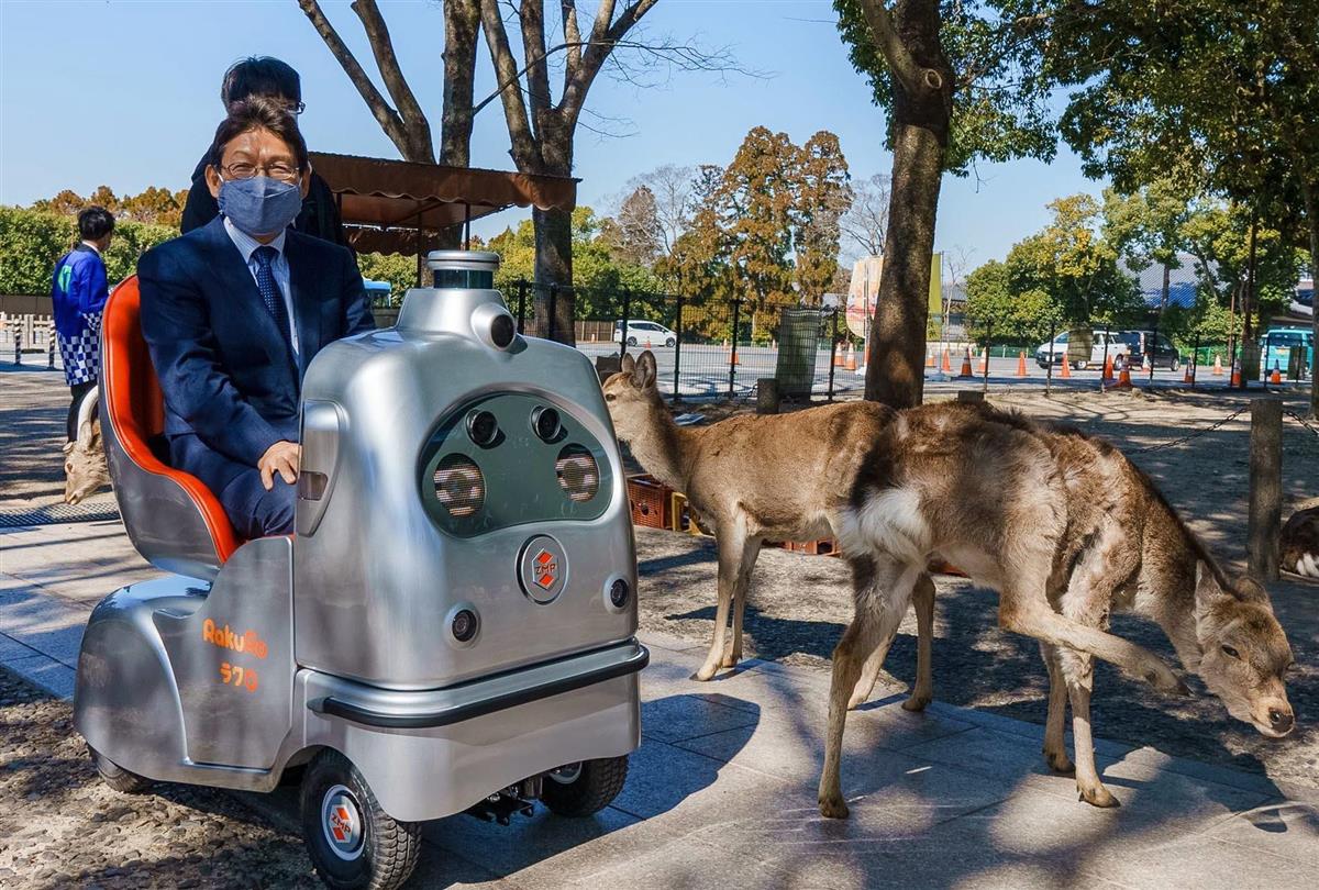 奈良県は、広大な奈良公園(奈良市)内を楽に移動してもらおうと、自動運転ロボットを走らせる社会実験を始めた。公園周辺には国の天然記念物「奈良のシカ」約1300頭が生息しており、2月に行われた実験では、のんびりとたたずむシカにロボットが「すみませんが、道をお譲りください」と音声で呼びかける光景がみられた。
