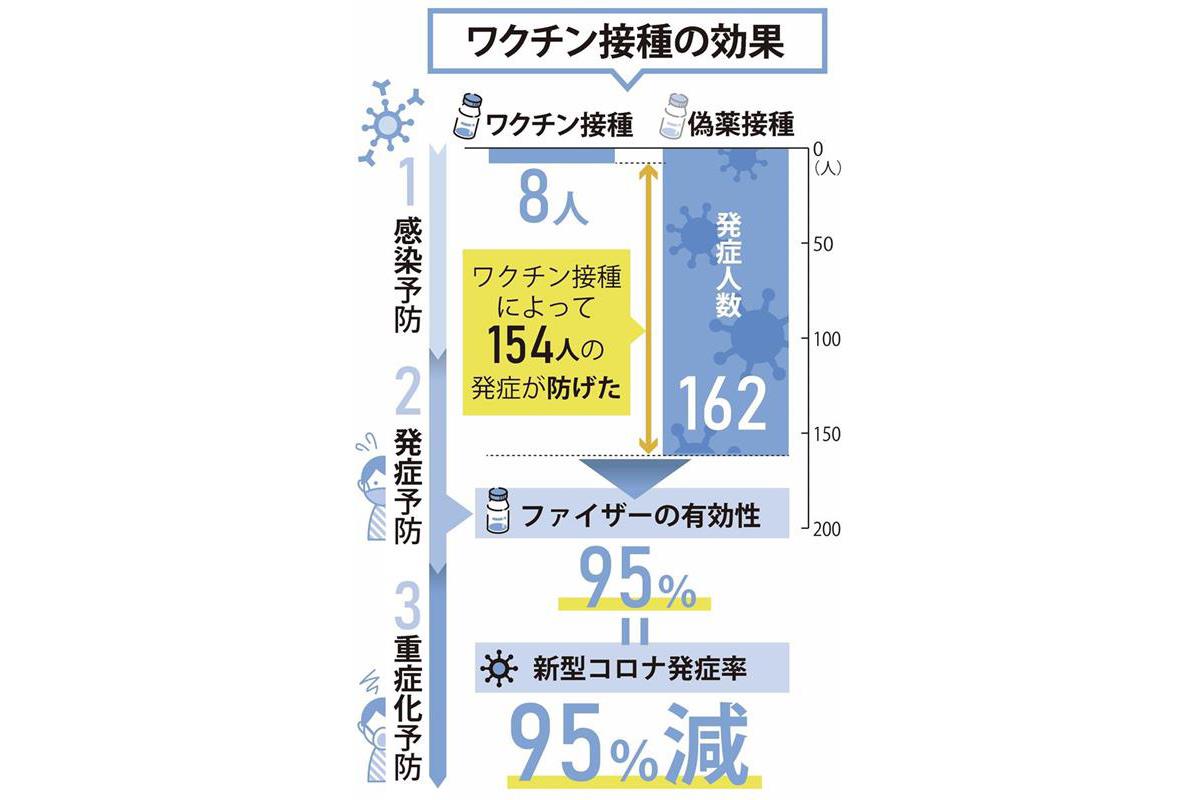 ファイザーが海外で実施した臨床試験データでさらに詳しくみると、ワクチンを接種した約1万8000人のうち発症者は8人だけ。一方、ワクチンではない「偽薬」を接種した約1万8000人の場合162人が発症した。ワクチン接種は偽薬接種に比べ154人分発症が少なく、割合でいうと95%の発症リスクが軽減されたとみることができる。