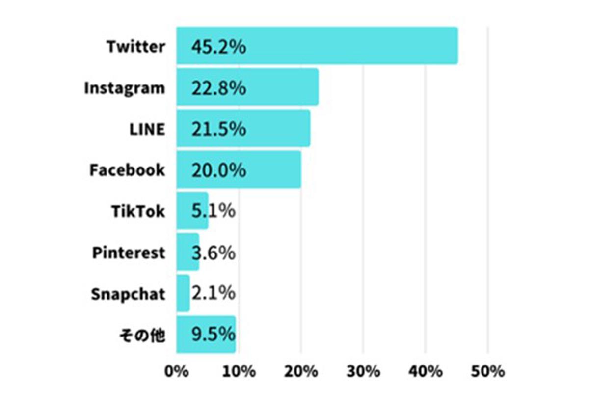 一方、よく閲覧するSNSは、Twitterが45.2%と最も多く、次いでInstgramが22.8%、LINE21.5%、Facebook20.0%の順だった。LINEは不特定多数の人に向けた投稿だけでなく、家族や友だちに向けたトークやタイムラインも含まれるため、他のSNSとは投稿・閲覧の意味が異なるが、それ以外のSNSでは全て「閲覧」が「投稿」を上回る結果となった。