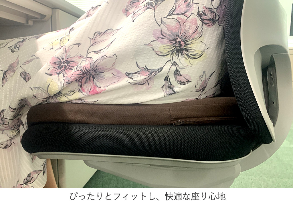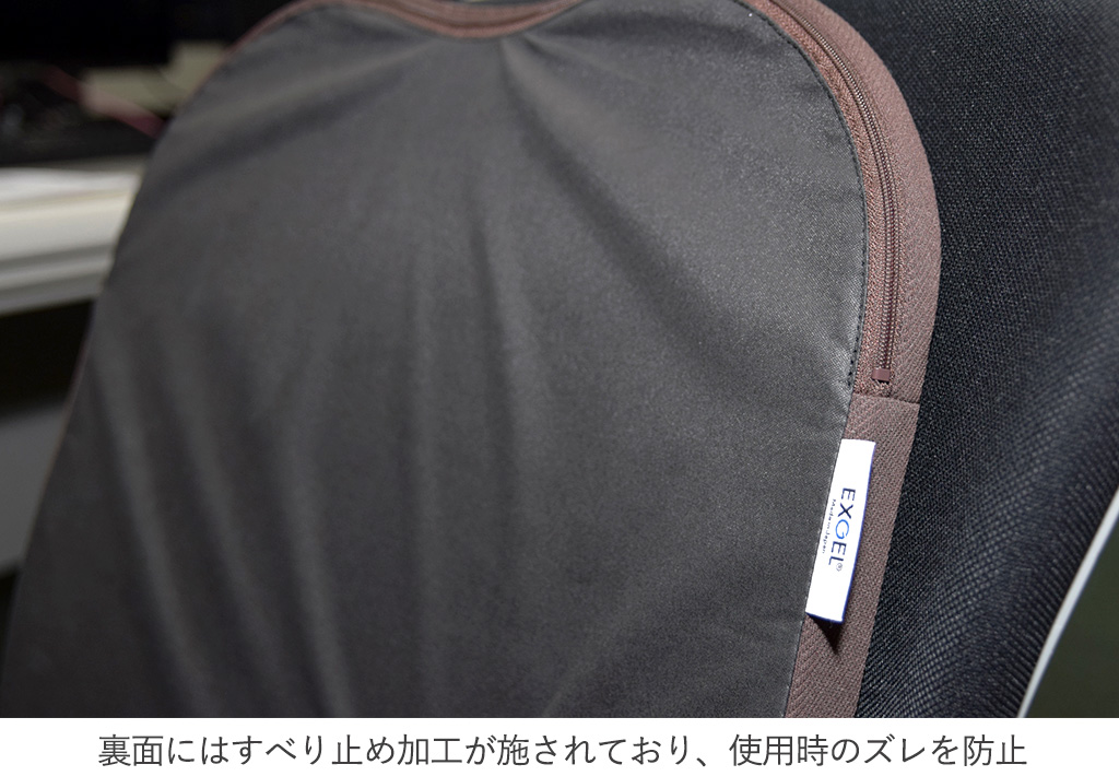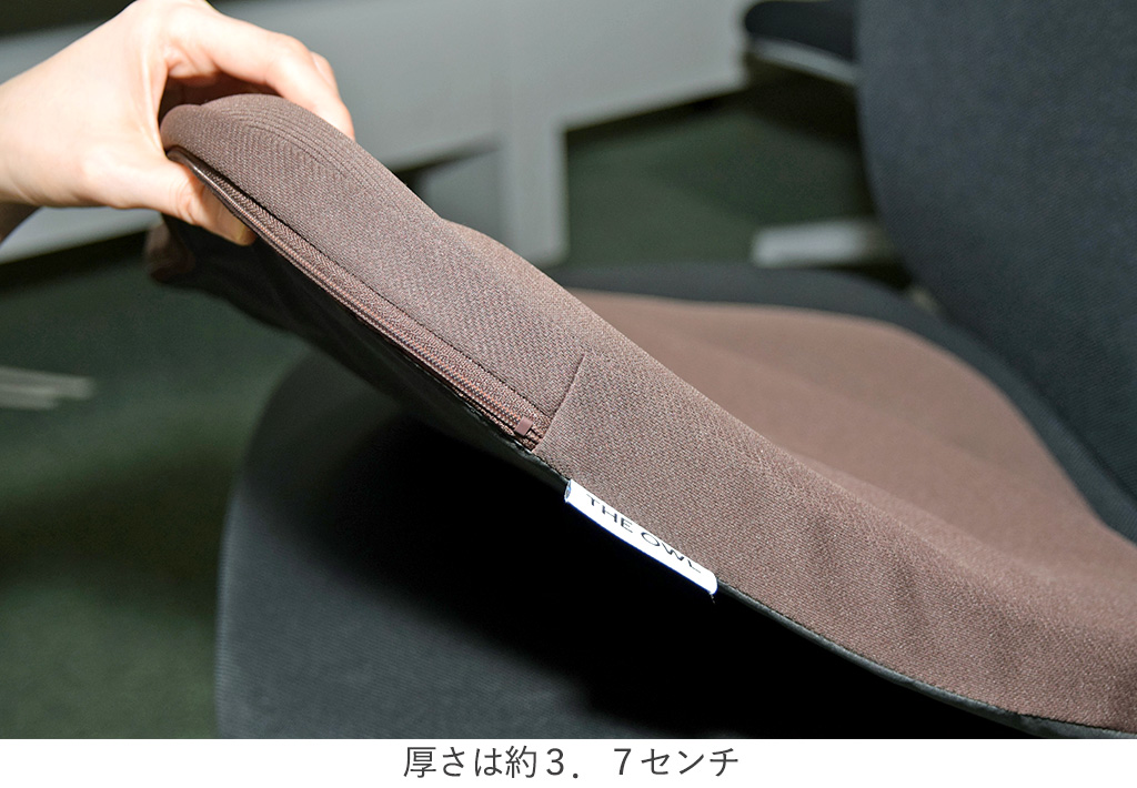 同商品には専用カバーも付いており、表面は通気性の高い素材を使用、裏面にはすべり止め加工が施されている。カバーのカラーは、どんなシーンにもマッチしそうなシックなブラウン。程よく厚みのある柔らかいカバーは、お尻のムレも緩和してくれそうな触り心地で、気温が上がってくるこれからの季節も、不快さを感じることなく使えそうだ。ナイロンのような裏面のすべり止めはズレることなく、安定した座り心地に一役買ってくれる。