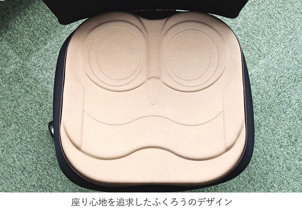 ふくろうの目の部分は、エクスジェルが包み込むようにして座骨にフィット、鼻の部分のくぼみは尾骨から仙骨にかけての突起部を保護、そして、太ももに当たる羽の部分は通気性を保ちつつ、やさしく受けとめる作りとなっている。また、ふくろうは幸福の象徴とも知られており、多くの人に幸福を届けたいとの思いが反映されたデザインでもある。