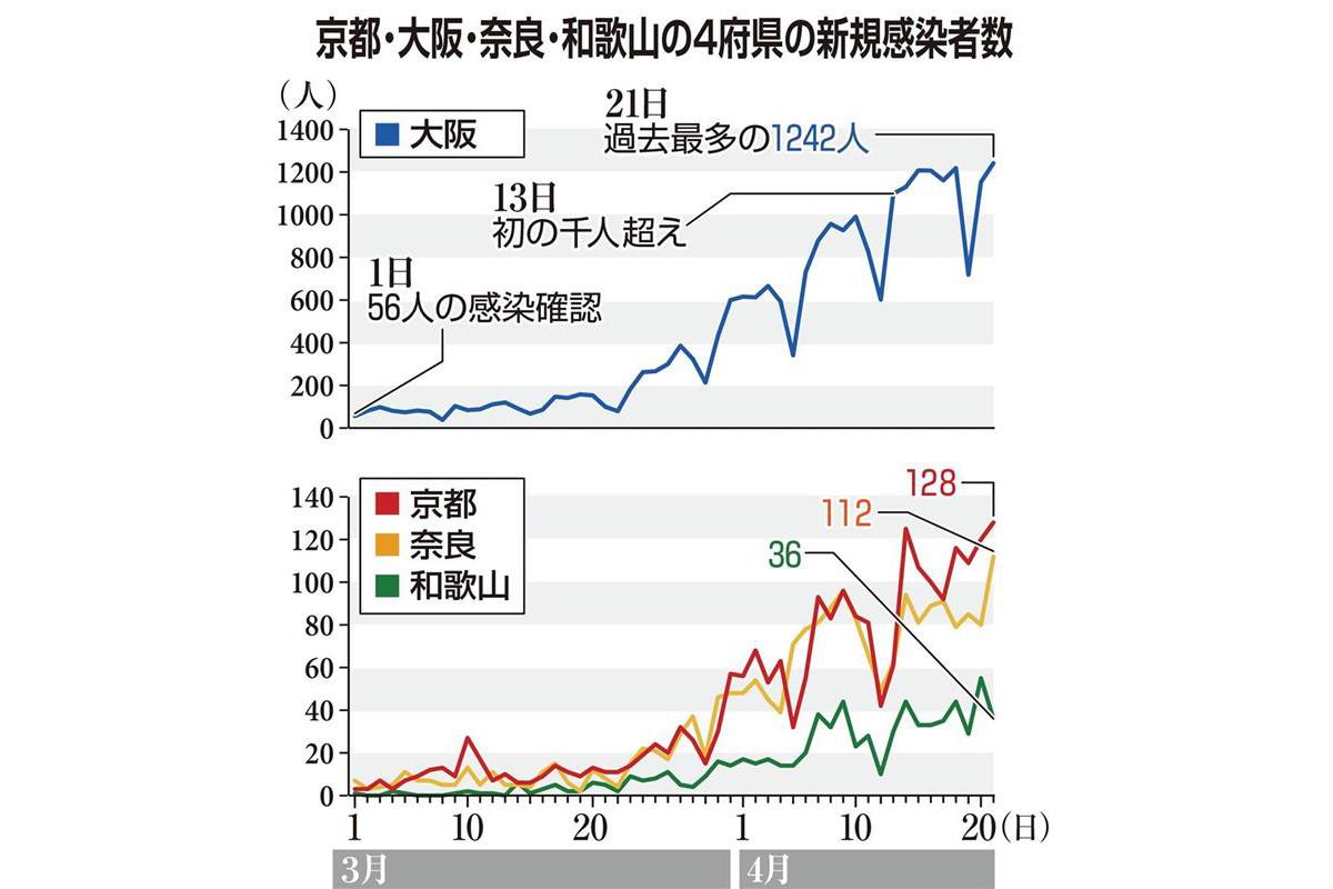 和歌山県、京都府の集計から産経新聞がまとめた。大阪府南部と隣接し、往来する県民が多い和歌山の感染者数は昨年11月以降は0~24人で推移したが、大阪と連動する形で3月下旬から増加。20日時点で55人と、過去最多を更新している。