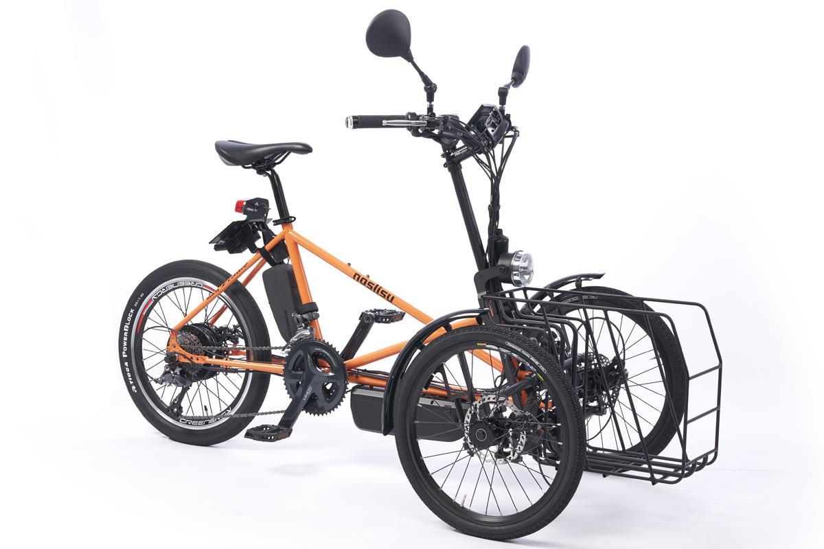 ノスリスはフル電動モデルと電動アシスト付き自転車の2種類。今回は電動モデルの「NA-01」に試乗した。引き締まったクロモリ素材のフレームが小径自転車のような印象を与えるが、道交法上の位置づけは「ミニカー」で普通自動車に区分される。運転には普通自動車免許が必要だ。